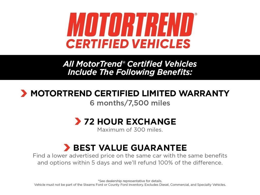 ONE PREVIOUS OWNER. LOW MILEAGE. ABS BRAKES. ALUMINUM WHEELS. CONVENIENCE PACKAGE. ILLUMINATED ENTRY SYSTEM. REAR VIEW CAMERA. SECURILOCK ANTI-THEFT SYSTEM. HEATED DOOR MIRRORS. FORD CO-PILOT360 ASSIST+. INDIVIDUAL TIRE PRESSURE MONITORING SYSTEM. FRONT PASS SENSING SYSTEM. STEERING WHEEL MOUNTED AUDIO AND CRUISE CONTROLS. Buy with Confidence from the Stearns Family â" Serving Our Community for Over 50 Years! At County, we make car buying easy and worry-free! Every vehicle under 5 years old and with less than 80,000 miles comes Motor Trend Certified â" packed with exclusive benefits: â